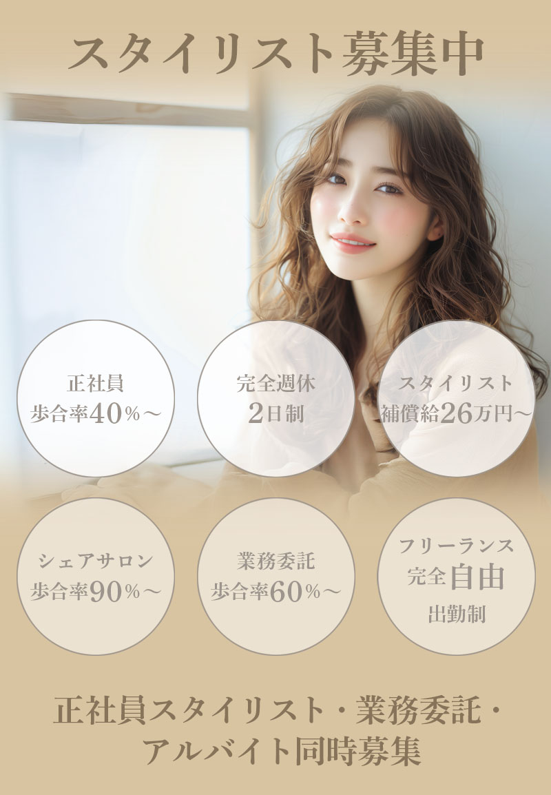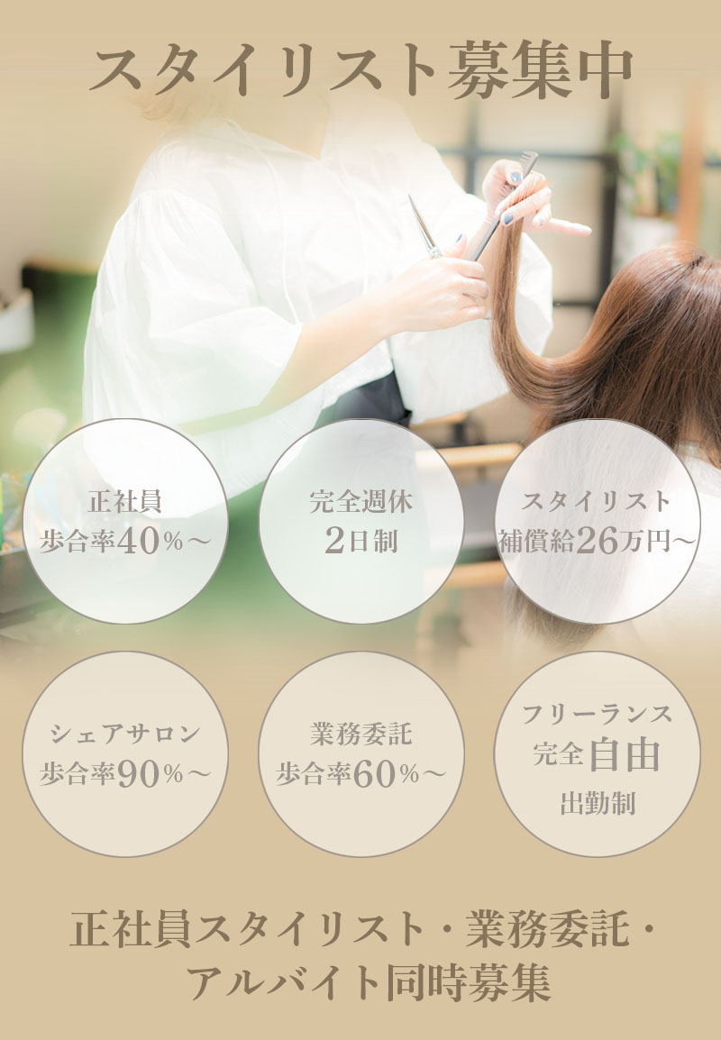 基本的に中途採用のスタイリストがメインで、前サロンで業務委託スタイリスト、正社員で雇用されていたスタイリストが活躍してます。